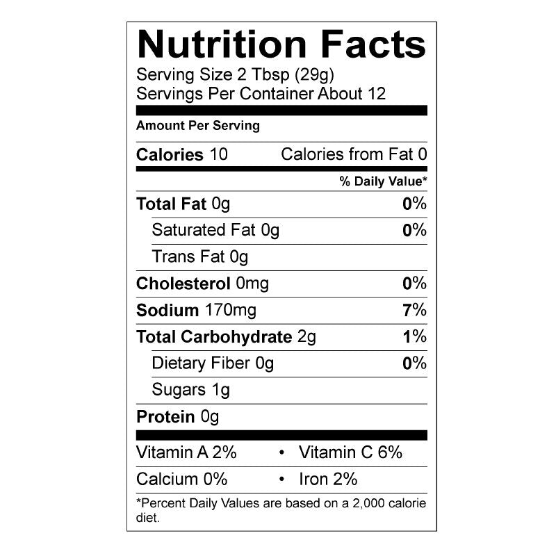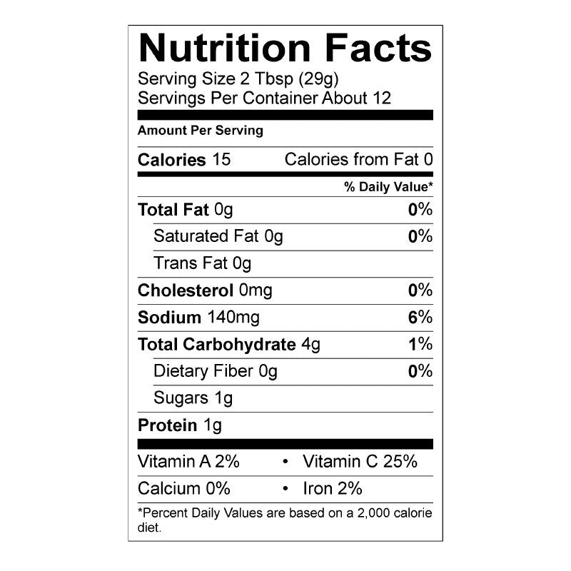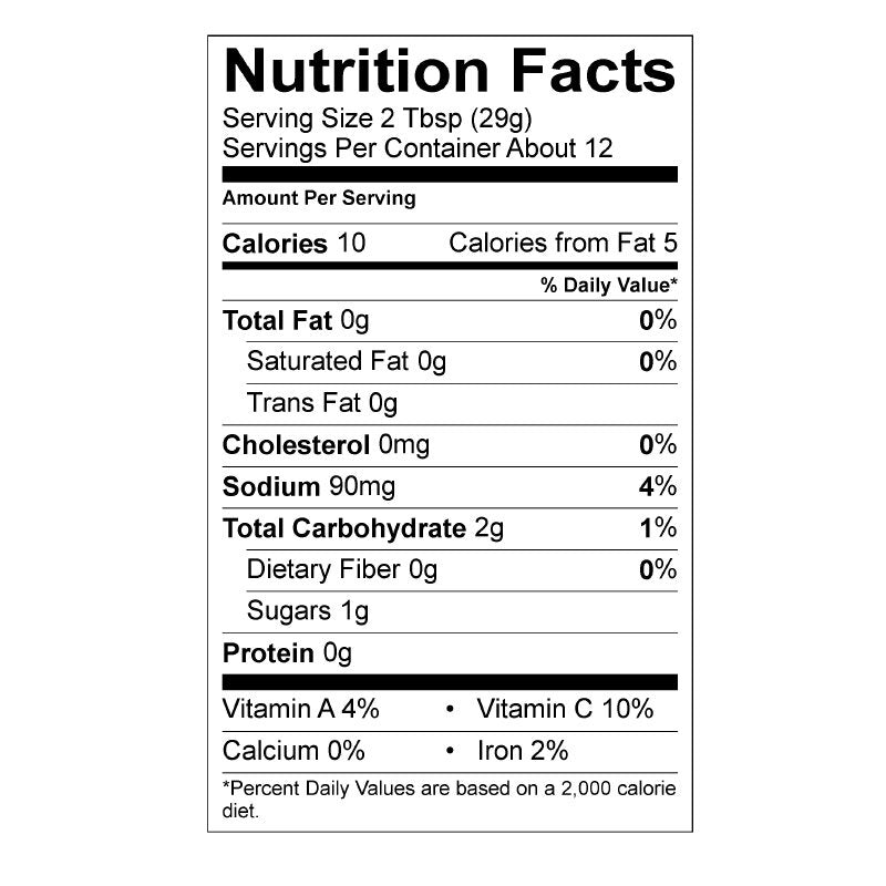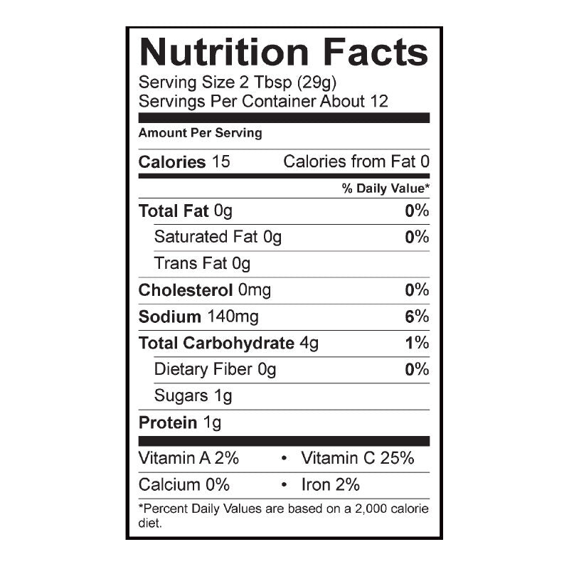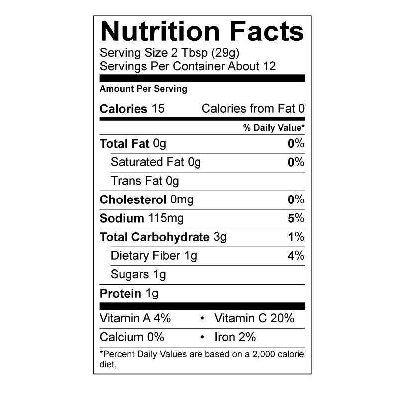 INGREDIENTS: Roasted Bell Peppers, Tomatillos, Corn, Roma Tomatoes, Garlic, Green Onions, Lime Juice, Cilantro, Jalapeño Peppers, Tangerine Vinegar (Grape Must, wine, vinegar, natural flavors, naturally occurring sulfites), salt, Habanero Peppers, white Vinegar, brown sugar (Sugar, cane molasses), Chile De Arbol Peppers, cumin.